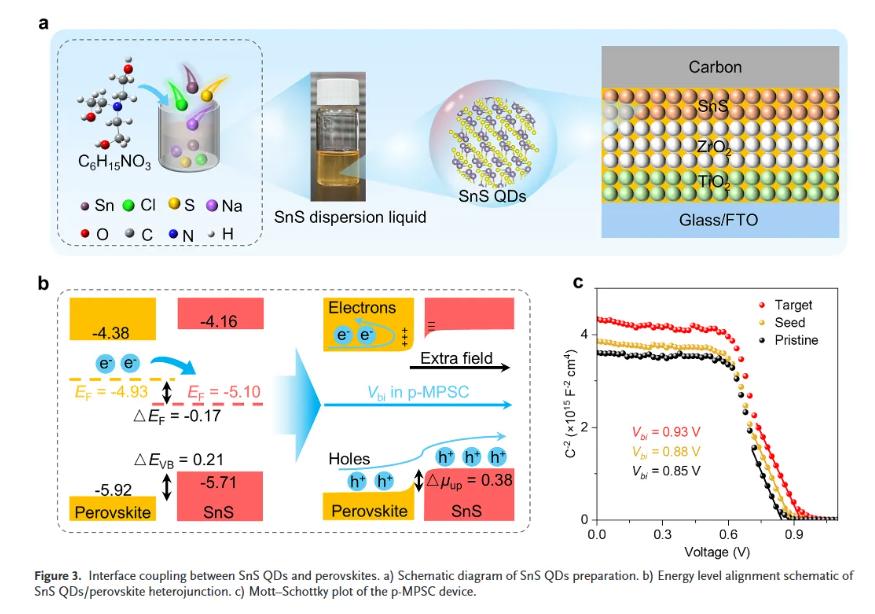 本文华东理工大学武文俊和朱为宏等人提出了一种创新的双策略,结合晶种诱导结晶和界面能级工程,以提升p-MPSC性能。具体而言,嵌入介观TiO₂电子传输层的CsPbBr₃晶种促进了大晶粒钙钛矿生长,同时在介孔ZrO₂上丝网印刷的SnS量子点(QD)层形成了II型SnS QD/钙钛矿异质结。该方法有效抑制了晶界复合,优化了能带对齐,降低了能量势垒,并增强了钙钛矿/碳界面的载流子动力学。最终p-MPSC实现了20.8%的PCE和1.067 V的开路电压(VOC),这是迄今有机-无机杂化p-MPSCs报道的最高VOC。