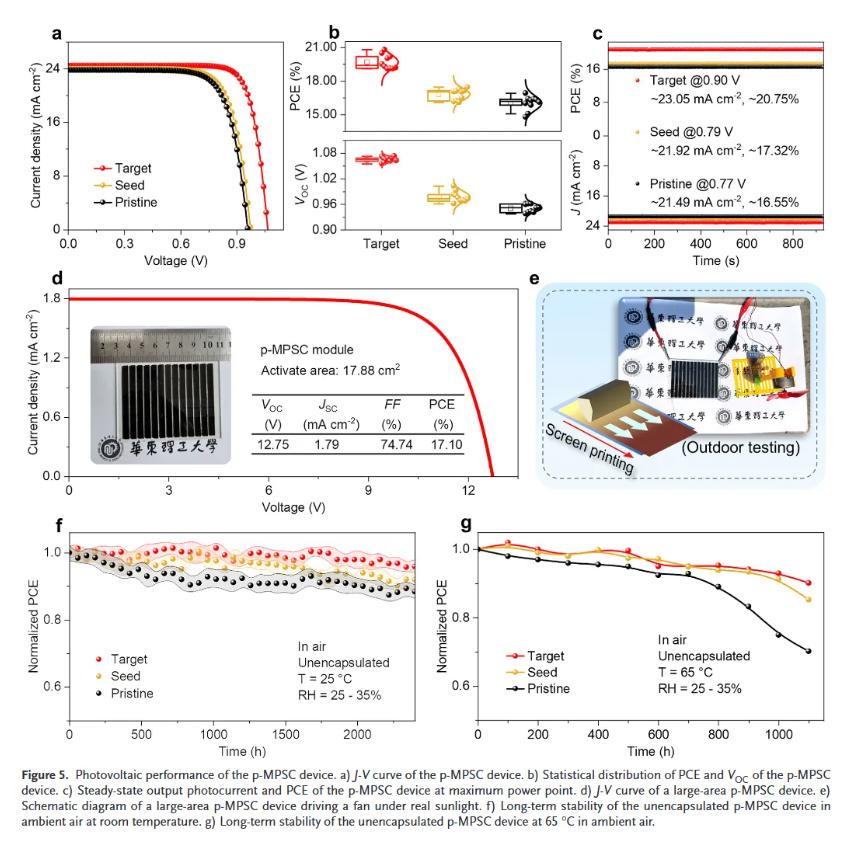 实现p-MPSC器件20.8%的PCE和1.067 V,为有机-无机杂化碳基钙钛矿电池的最高开路电压,同时大面积组件(17.88 cm²)效率达17.1%。