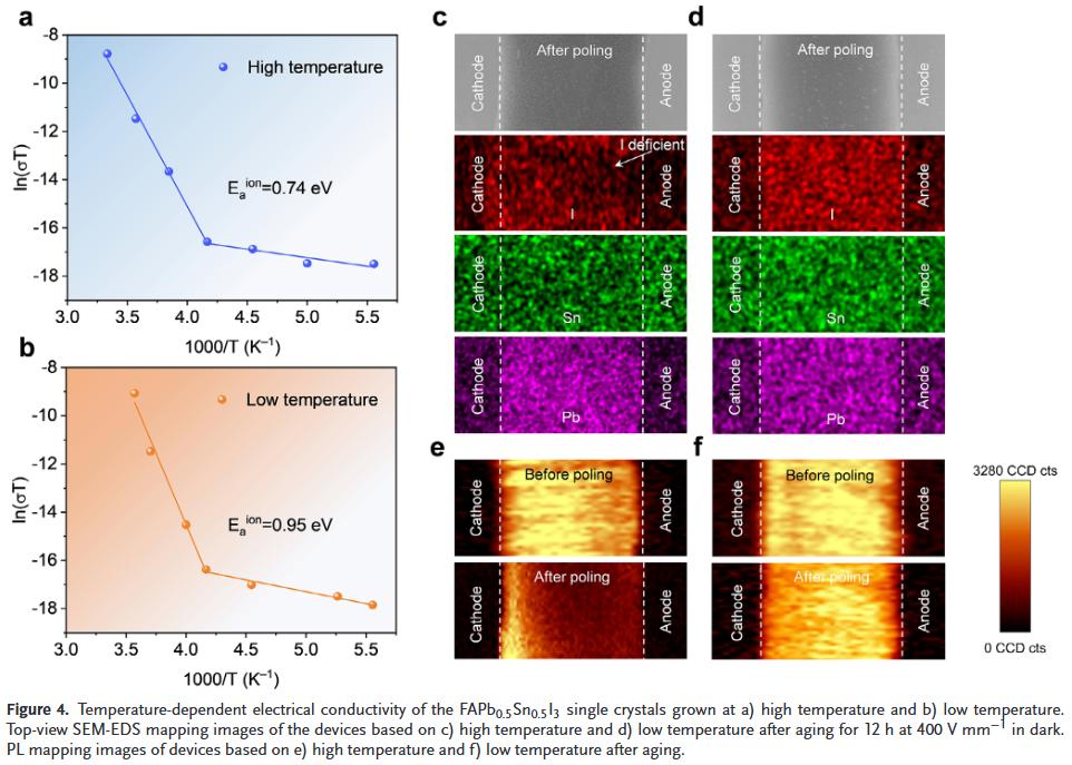 FAPb₀.₅Sn₀.₅I₃单晶的离子迁移活化能高达0.95 eV,暗电流密度低至0.75 nA cm⁻²,电流漂移极小,优于铅基钙钛矿探测器。