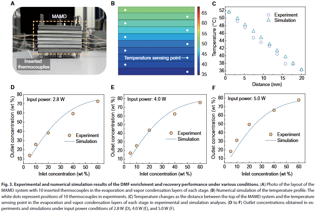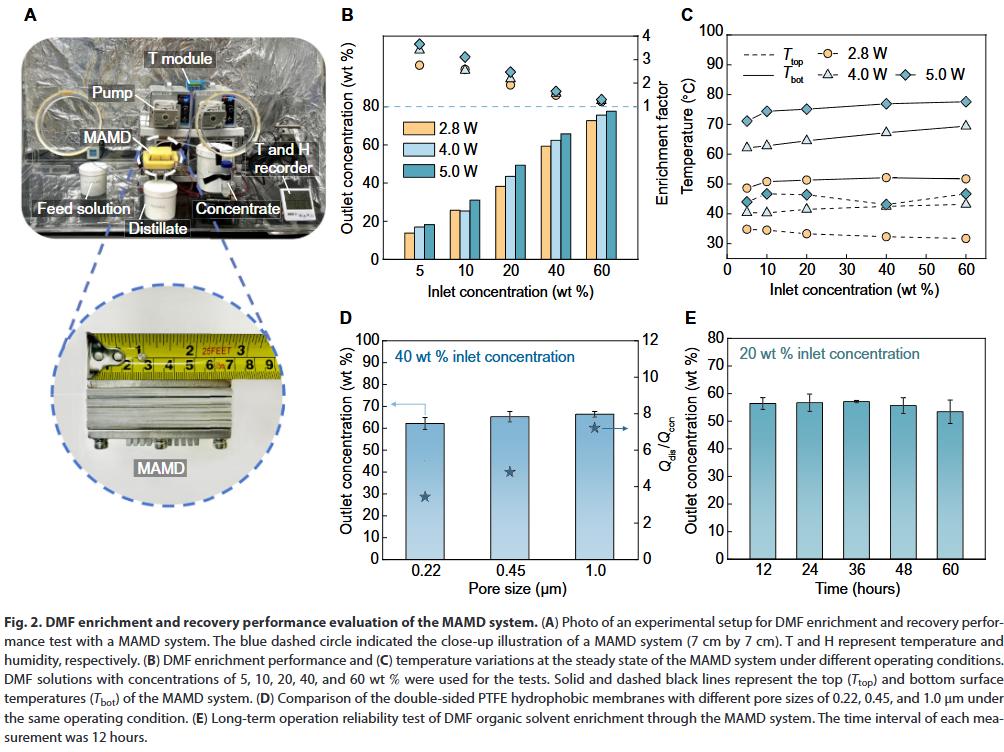 开发的多级气隙膜蒸馏(MAMD)系统可将DMF从0.3 wt% 的低浓度废液中富集至94.2 wt%,富集因子高达314,并实现60小时以上稳定运行。