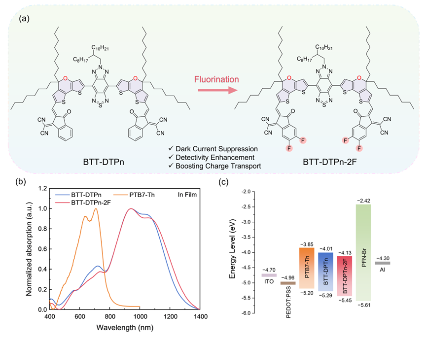 a) 窄带隙非富勒烯受体 BTT-DTPn 和 BTT-DTPn-2F 的分子结构;b) 本研究中有机光电探测器(OPD)的能级示意图;c) PTB7-Th、BTT-DTPn 与 BTT-DTPn-2F 薄膜的归一化吸收光谱。