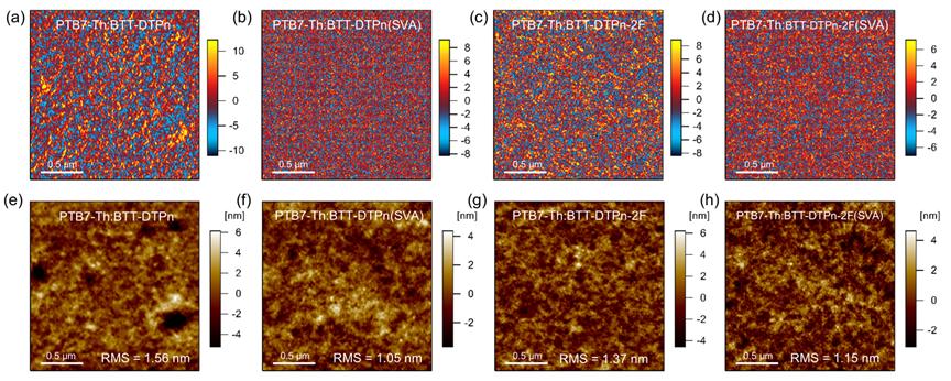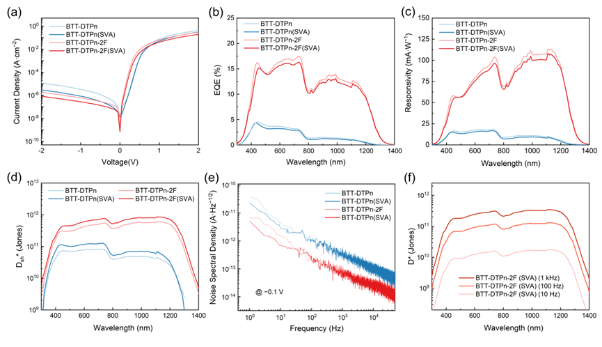 a) 基于BTT-DTPn 和 BTT-DTPn-2F 的 OPD 在未经处理与经溶剂蒸汽退火(SVA)后的暗电流密度–电压特性;b) 器件在 −0.1 V 偏压下的外量子效率(EQE)光谱;c) 器件在 −0.1 V 偏压下的光响应度(R)光谱;d) 基于 −0.1 V 暗电流密度(Jd)计算得到的受散粒噪声限制的比探测率(D*)曲线;e) 器件在 −0.1 V 偏压下的噪声电流谱密度;f) 基于噪声谱密度在不同频率下计算得到的 BTT-DTPn-2F 器件的比探测率曲线(−0.1 V 偏压)。