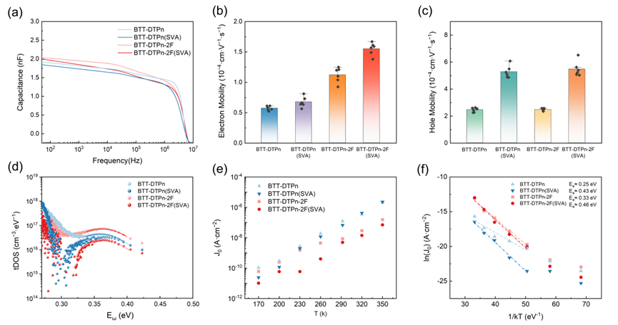 a) 在暗态 0 V 偏压下测得的 OPD 电容–频率(C–ω)曲线;b) 基于单电子器件获得的电子迁移率统计图;c) 基于单空穴器件获得的空穴迁移率统计图(均为 BTT-DTPn 与 BTT-DTPn-2F 器件,未经处理与经 SVA 处理对比);误差棒表示在 1.5 cm × 1.5 cm 基底多点测量所得标准差,体现 SVA 处理后器件电荷传输的空间均一性;d) 通过 C–ω 表征得到的陷阱态密度(tDOS)分布及高斯拟合(实线为高斯拟合曲线);e) 器件暗饱和电流密度(J0)的温度依赖关系;f) ln(J0) 与温度倒数的关系曲线(虚线为线性拟合)。