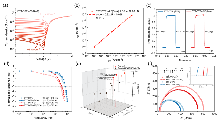 a) 基于BTT-DTPn-2F(SVA 处理)器件在 1085 nm 激光照射下的 J–V 特性随光强变化曲线;b) 器件在线性动态范围(LDR)的提取结果(−0.1 V 偏压下,虚线为线性拟合);c) 基于 BTT-DTPn(SVA)和 BTT-DTPn-2F(SVA)器件在10 kHz 方波调制、1050 nm 光照下的瞬态响应曲线;d)器件的 −3 dB 截止频率;e) 本研究优化器件与已报道窄带隙非富勒烯受体(NFA)SWIR OPD 的性能参数对比;f) 器件阻抗谱的 Nyquist 图及等效电路模型。