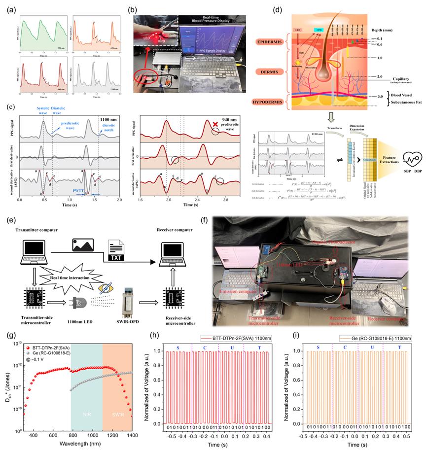 SWIR OPD 应用设计。a) 不同波长 LED 光照下采集的光电容积脉搏波(PPG)信号;b) 基于 AFE4490芯片的非侵入式健康监测原型机实物图;c) 在 1100 nm 与 940 nm LED 光照下的 PPG 信号分析;d) PPG 采集与血压估算信号处理的示意图;e) 实时光通信系统设计图;f) 近红外(NIR)实时光通信物理系统示意图;g) SWIR OPD 与锗探测器在 −0.1 V 下的噪声电流谱密度对比;h) 基于 SWIR OPD 的通信示波图;i) 基于锗探测器的通信示波图(传输内容为“SCUT”)。