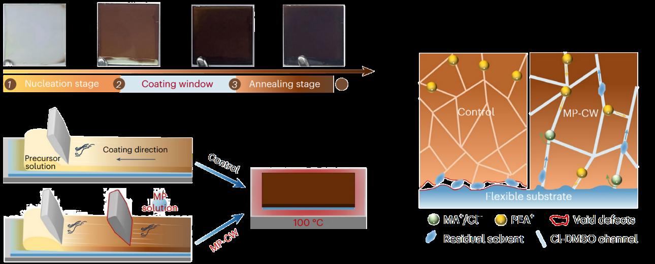 此次研发合作中,南京大学创新性地开发了“原位添加剂涂层策略”,在连续气体淬火条件下,向湿润的钙钛矿薄膜动态引入添加剂,通过离子通道可以精准的输送添加剂到缺陷处,精准调控结晶过程,提升柔性基板上的薄膜质量。