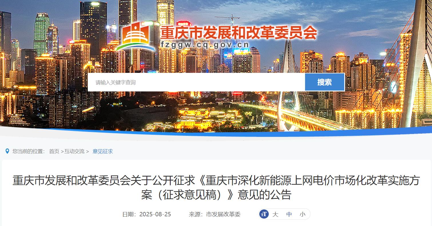 促进新能源高质量发展的通知》(发改价格〔2025〕136号)相关要求,结合我市实际,我委牵头起草了《重庆市深化新能源上网电价市场化改革实施方案(征求意见稿)》。现面向社会公开征求意见。