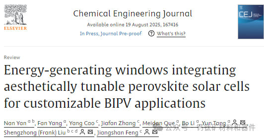 近日,西安建筑科技大学的汤云教授与中科院大连化学物理研究所的刘生忠教授和陕西师范大学的冯江山副教授近日在知名期刊Chemical Engineering Journal上发表的题为“Energy-generating windows integrating aesthetically tunable perovskite solar cells for customizable BIPV applications”的文章,系统梳理了半透明与彩色钙钛矿太阳能电池在建筑一体化光伏中的应用现状与发展前景。该文深入分析了ST-PSCs在光吸收、透射与反射之间的平衡策略,探讨了通过能带调控、微结构设计、多层光学结构与透明电极优化等手段实现高效率与高透光率兼得的可行方案。文章还总结了当前面临的技术挑战,并提出了未来研究的方向,特别是在界面稳定性、大面积制备与多场景适用性方面的突破点。
