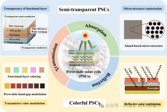 通过微图案化、岛状结构、光子晶体和逆向蛋白石(IO)等微纳结构设计,可在不影响光电性能的前提下实现颜色的动态调控与透光率的提升。例如,通过溶胀诱导裂纹法制备的钙钛矿微电池可实现20.1%的PCE,且具备良好的角度依赖性色彩表现。