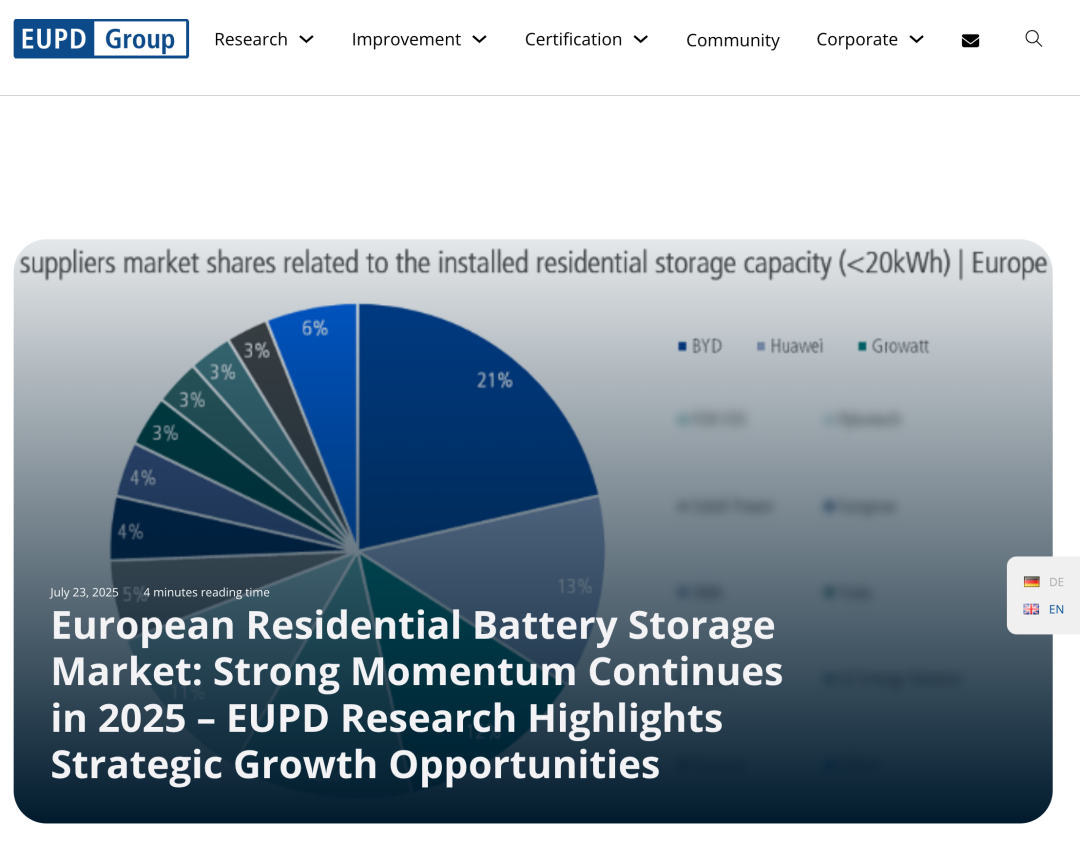 根据EUPD Research 数据显示:欧洲户储市场在竞争方面依旧高度活跃。