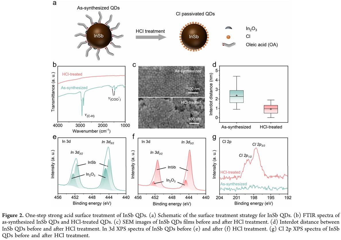 提出了一步式强酸表面处理策略,可以同时实现取代量子点原有长链绝缘配体、消除表面氧化铟缺陷的作用。
