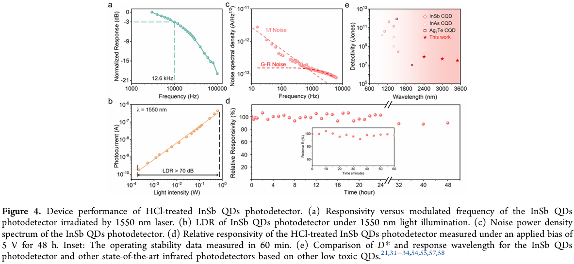 该器件在3.0 μm处的比探测率达到4.7 × 10⁷ Jones,是迄今为止报道的最长波长的无铅/无汞QDs带间光电探测器。这项工作为室温操作、无重金属QDs中波红外探测器的发展迈出了重要一步。