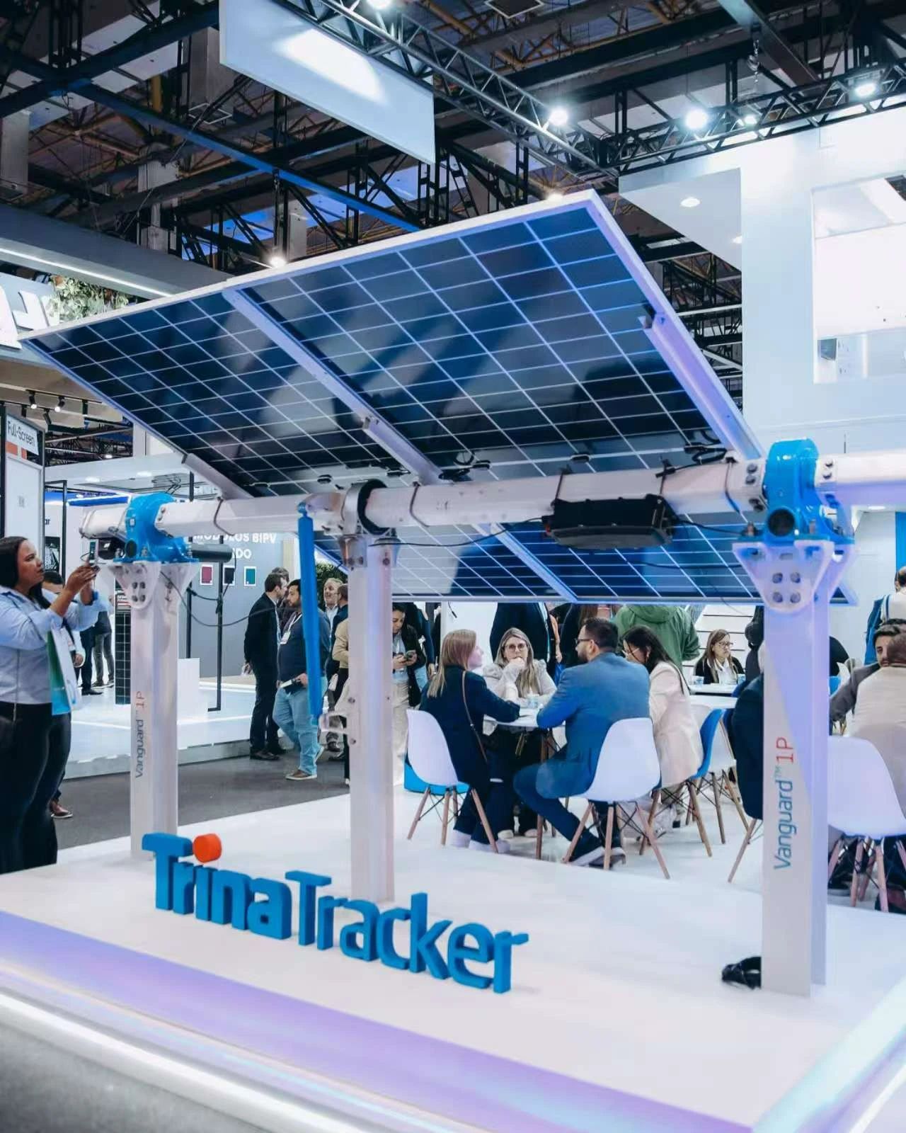 展会还展出了天合跟踪为南美市场量身打造电气化升级的开拓者1P跟踪支架系统。该产品搭载自研SuperTrack智能算法,通过融合AI、大数据,结合双面辐照模型、遮挡优化模型,可精准捕捉日照,为光伏电站最高带来8%的发电增益。此外,该跟踪系统搭载行业首推的支架级智慧云,集大风、冰雹等多重极端气候保护策略。依托实时数据监测,系统可智能诊断异常情况,帮助运维团队进行精准运维管理,在保障电站安全稳定运行的同时,为光伏电站智能化注入强劲科技动能 。