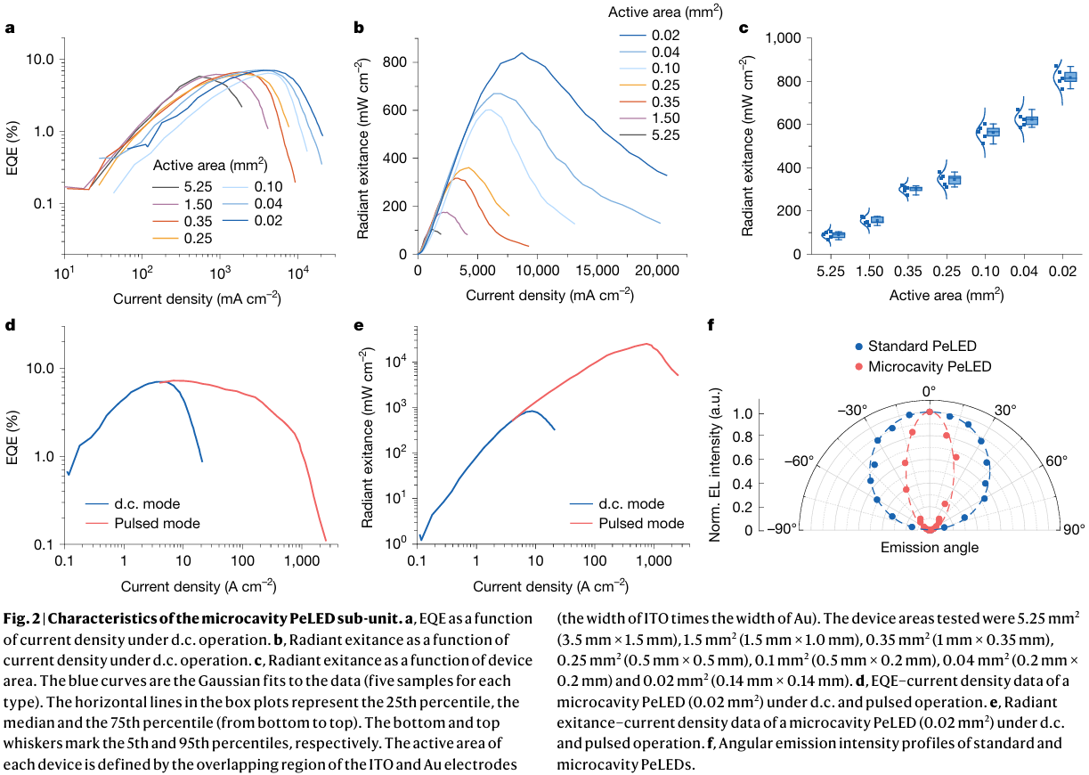首次实现电驱动钙钛矿激光器:通过双腔垂直集成结构,成功将高功率微腔PeLED与低阈值单晶钙钛矿微腔耦合,实现了电泵浦激光发射,最低阈值低至92 A