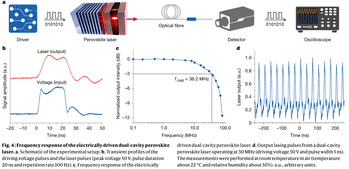 器件的工作半衰期(T₅₀)达到1.8小时(10 Hz下6.4×10⁴个电压脉冲),稳定性优于电泵浦有机激光器。该双腔钙钛矿激光器可实现36.2 MHz的快速调制,显示出在数据传输和计算应用中的潜力。