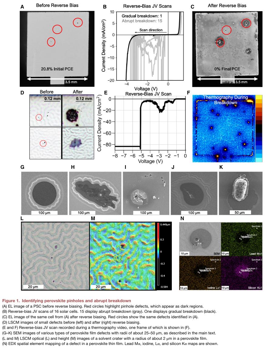 本研究科罗拉多大学博尔德分校Michael D. McGehee等人通过电学测试、电子显微镜、光学及热成像技术,系统探究了在低反向电位(< |−2| V)下的突变击穿与热点形成现象。我们发现,钙钛矿层中的微观针孔会在反向偏压下引发快速且破坏性的击穿,尽管这些缺陷对光电转换效率的影响甚微。通过对微型(直径200微米)钙钛矿电池以及无钙钛矿的传输层二极管进行测试,结果表明突变性低电压击穿源于纳米至微米级缺陷,而金属迁移与导电细丝形成并非主要原因。当钙钛矿层和传输层中的针孔被消除后,器件的反向偏压稳定性显著提高。