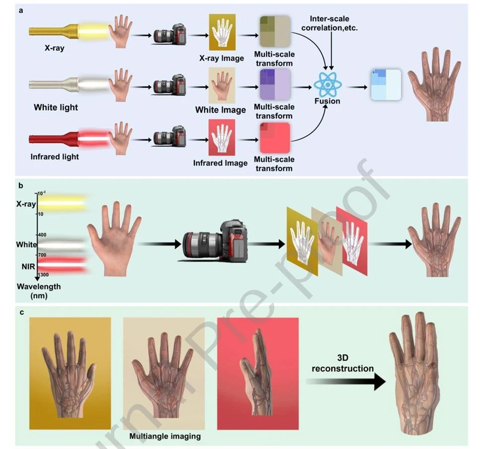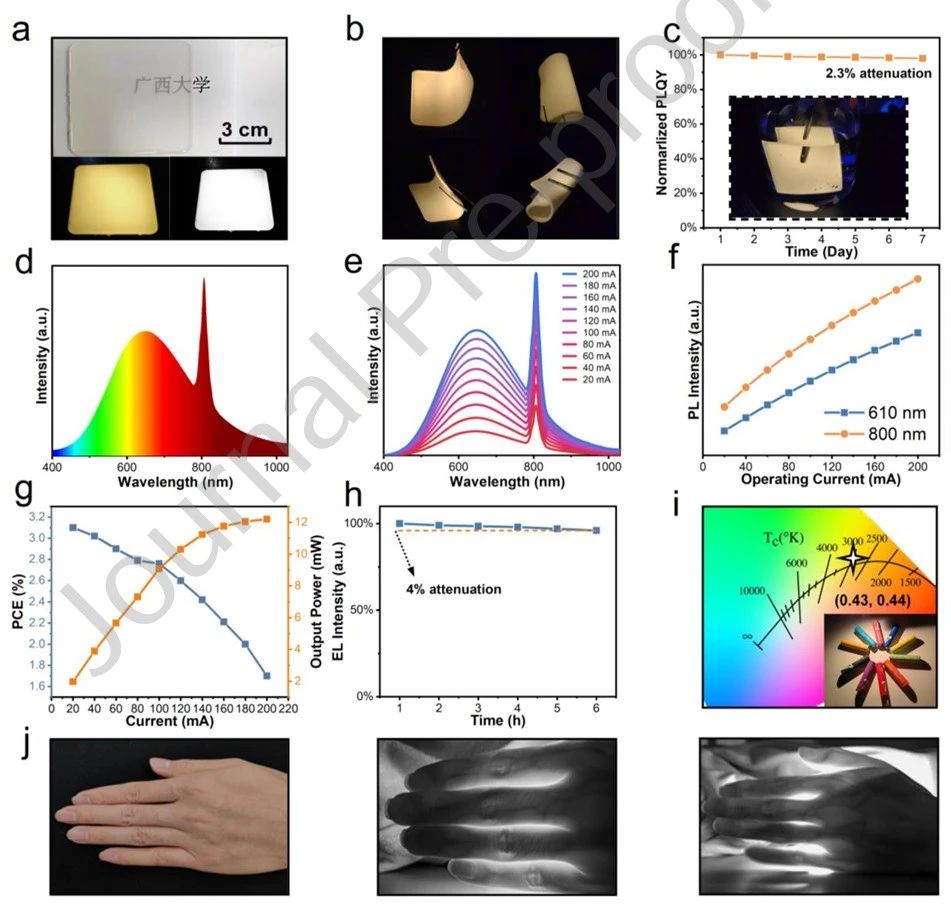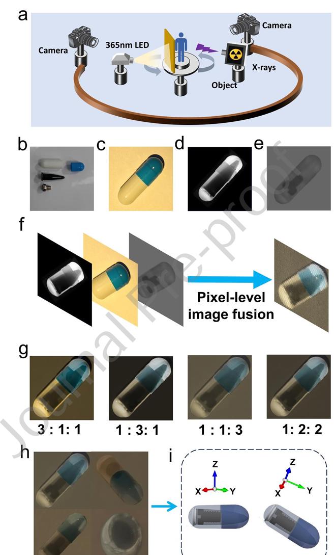 基于该材料制备的大面积柔性薄膜(10×10 cm)成功实现无需复杂算法的像素级X射线-近红外-白光图像融合,可同时清晰呈现胶囊外壳、内部离心管及金属螺丝的结构信息,极大简化多光谱成像系统。