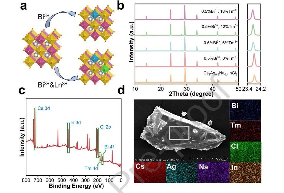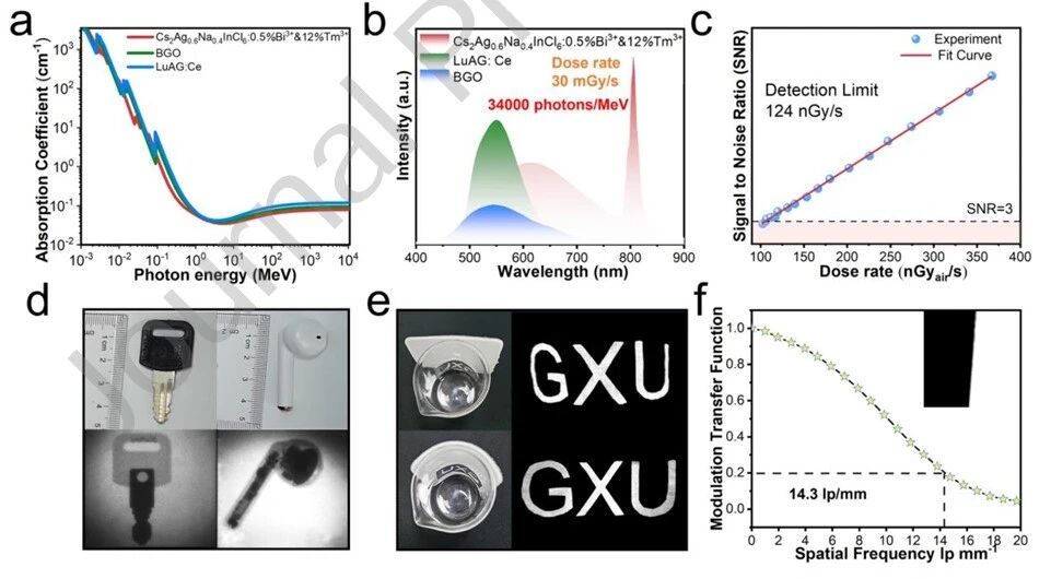 研究成功合成Bi³⁺/Tm³⁺共掺杂Cs₂Ag₀.₆Na₀.₄InCl₆双钙钛矿,在365 nm激发下产生暖白光(610 nm)和多重近红外发射(810/1220/1430 nm),并在X射线激发下表现出高亮度辐射发光(光产额34000光子/MeV),首次在单一材料中集成可见光-近红外-X射线三模态发光。