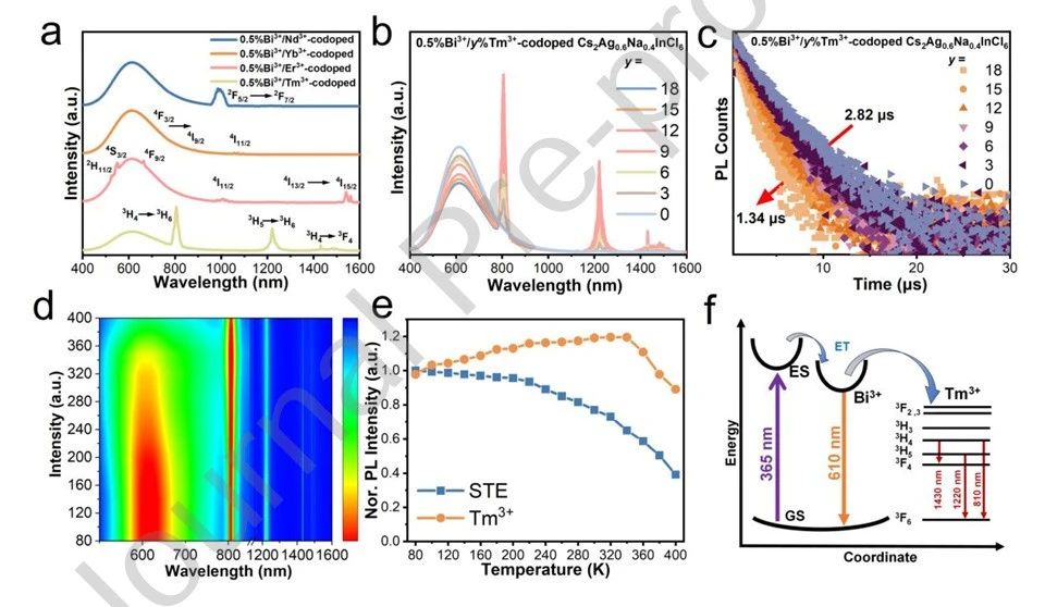 多光谱图像融合技术能够通过整合同一场景的多波段信息显著提升人类与机器的感知能力。然而,当前方法需采用多种不同光谱响应的发光材料,并通过复杂算法和系统解决像素与位置失配问题。为克服上述缺陷,本研究广西大学彭辉等人通过水热法合成了一系列Bi³⁺/Ln³⁺共掺杂Cs₂Ag₀.₆Na₀.₄InCl₆双钙钛矿材料(Ln³⁺ = Tm³⁺, Er³⁺, Nd³⁺, Yb³⁺)。在365 nm紫外光激发下,Bi³⁺/Tm³⁺共掺杂样品可同时发射高效的暖白光(610 nm)和多重近红外发光峰(810/1220/1430 nm),分别源于自陷态激子发光和Tm³⁺的f-f跃迁。值得注意的是,该材料在X射线照射下还可产生明亮的辐射发光,光产额高达34000 ± 1000 photons/MeV。