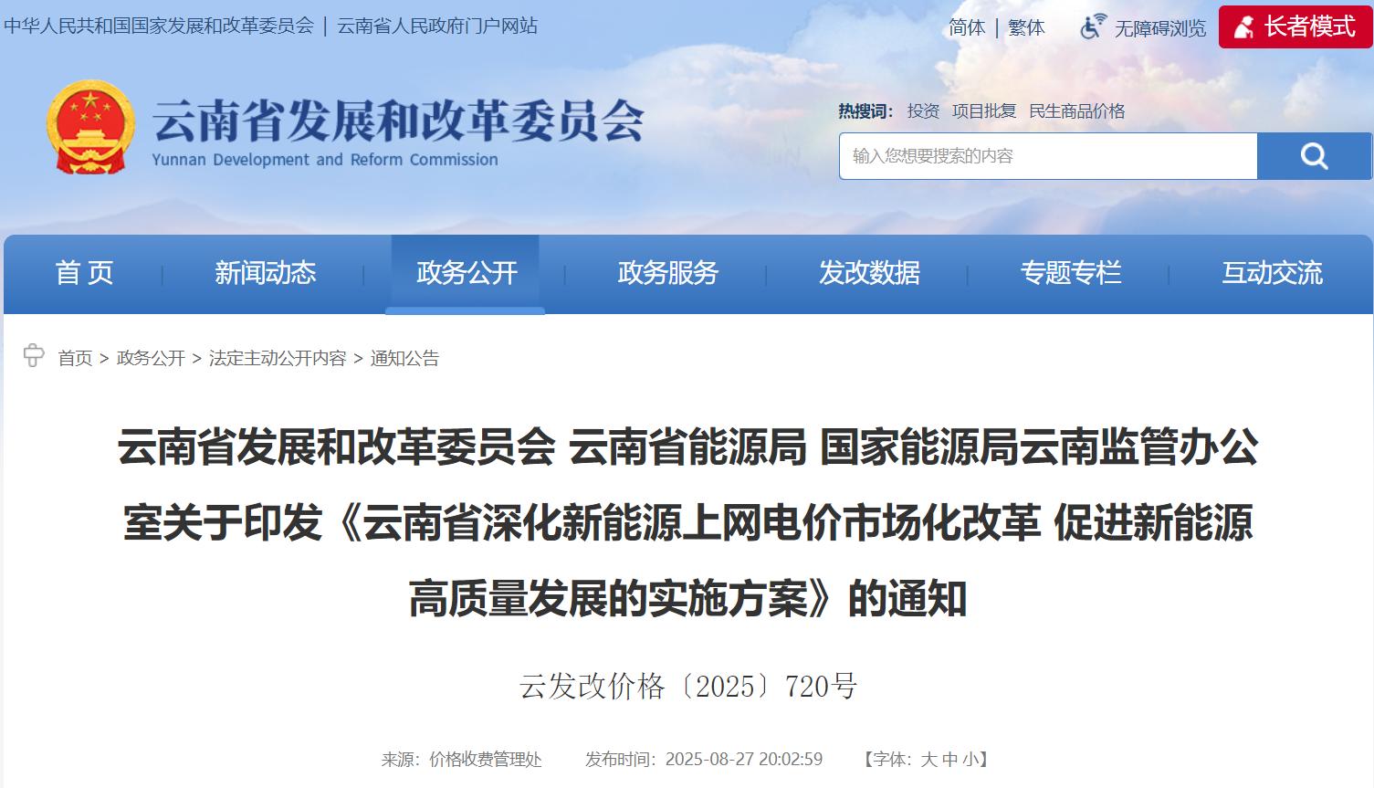 8月27日,云南省发展和改革委员会、云南省能源局、国家能源局云南监管办公室联合印发《云南省深化新能源上网电价市场化改革 促进新能源高质量发展的实施》。