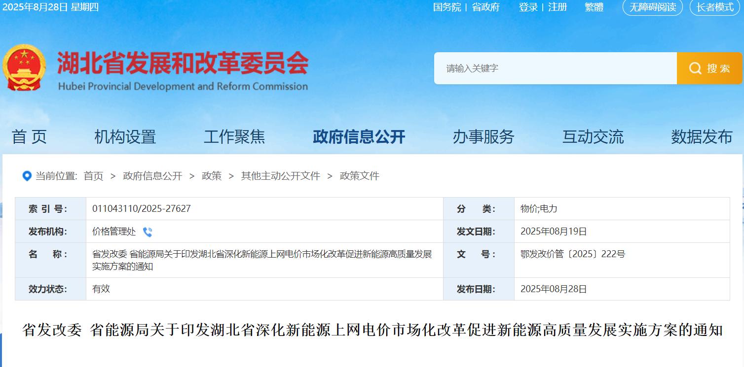 8月28日,湖北省发改委、湖北省能源局联合下发《湖北省深化新能源上网电价市场化改革促进新能源高质量发展实施方案》的通知及政策的文字解读(政策原文及官方解读见附件),方案自2025年10月1日起实施。