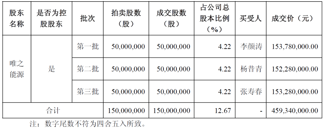 8 月 28 日,亿晶光电(600537)发布控股股东所持公司股份第二次司法拍卖进展公告。公告显示,截至披露日,本次司法拍卖网拍阶段已结束,控股股东唯之能源所持 1.5 亿股无限售流通股(拆分为三批,每批 5000 万股同步上拍)全部成功拍出,合计成交金额 4.5934 亿元。
