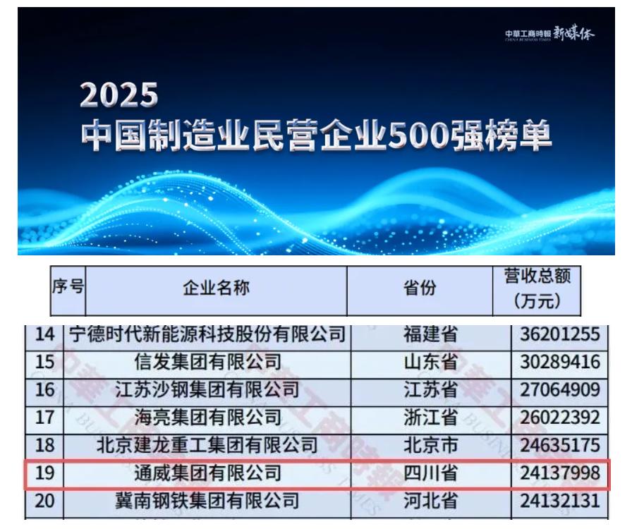 凭借稳健的发展态势和强劲的竞争实力,通威荣列“2025中国民营企业500强”榜单第25位、“2025中国制造业民营企业500强”榜单第19位,位居四川上榜企业榜首。