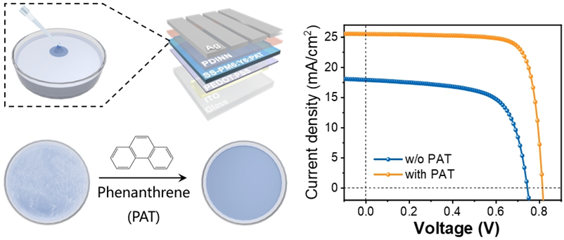 针对这一挑战,西湖大学柳佃义课题组系统地研究了芳香族固体添加剂对SS工艺的影响,其中菲(phenanthrene,PAT)延长了湿膜的干燥时间,有效抑制了受体的过度聚集,提升了分子堆积有序性,同时优化了SS薄膜的相分离形态。在绿色溶剂邻二甲苯体系中,通过在活性层中加入PAT,在水面上形成了厚度均匀的SS-PM6:Y6薄膜,开发了一种用于制造SS-OPV的新型自发扩散成膜工艺。