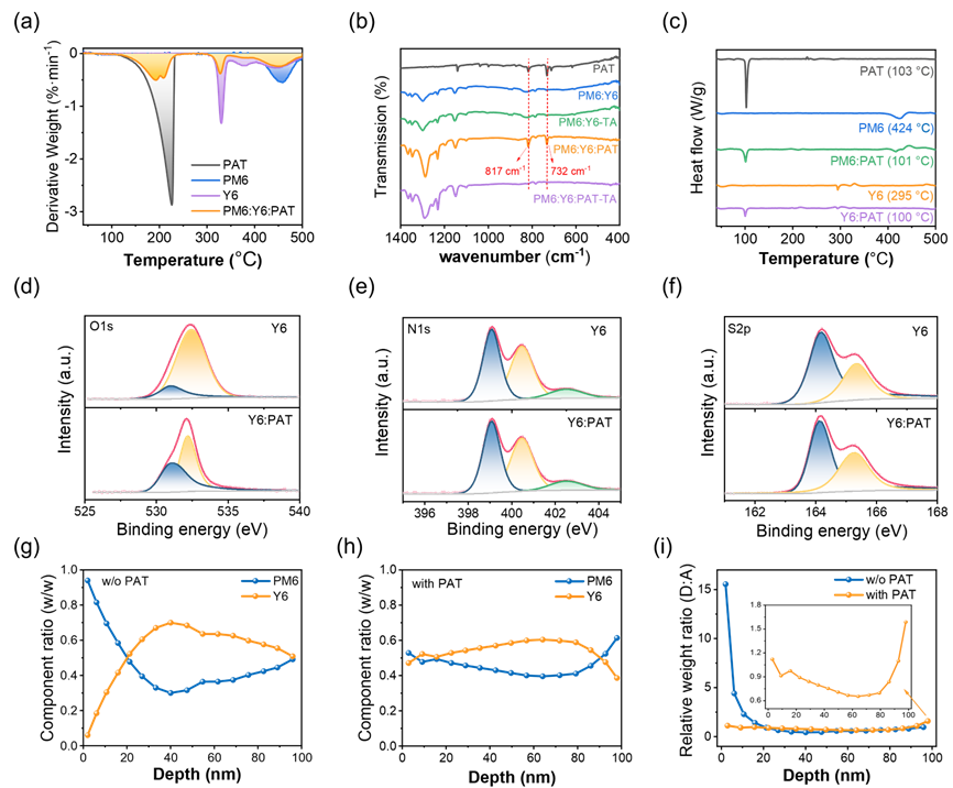 图2. PAT对热稳定性与分子相互作用的影响。(a)热重曲线(TGA);(b) SS-PM6:Y6和SS-PM6:Y6:PAT薄膜在未经/经热退火(100 ℃, 2 min)处理下的FT-IR光谱;(c) 差示扫描量热(DSC)升温曲线;(d) O 1s,(e) N 1s,(f) S 2p 的XPS谱图;(g–h) SS薄膜的垂直相分布曲线;(i) SS薄膜的供体:受体(D:A)比例随深度的变化(深度值0代表水面侧,100代表空气侧)。