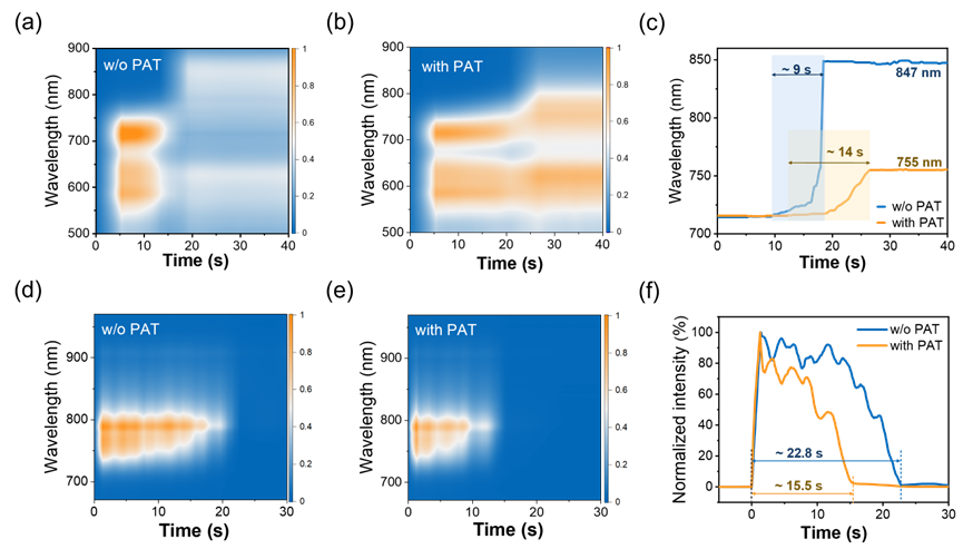 图3. 成膜动力学的原位表征。(a–b) PM6:Y6与PM6:Y6:PAT溶液在SS过程中随时间演化的吸收光谱;(c) Y6吸收峰随时间的变化;(d–e) 荧光光谱随时间的演化图;(f) 在790 nm处的荧光强度随时间变化曲线。