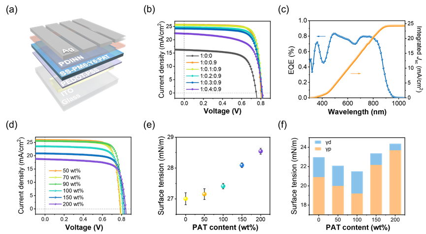 图4. SS-OPVs的器件性能。(a)器件结构示意图;(b) 不同PC71BM和PAT比例的器件J–V曲线;(c) 含PM6:Y6:PC71BM:PAT(0.8:1:0.1:0.9)薄膜的SS-OPV的外量子效率(EQE)光谱及积分光电流;不同PAT含量下 (d) 器件的J–V曲线、(e)活性层溶液的表面张力、(f) 薄膜水面侧的表面张力。