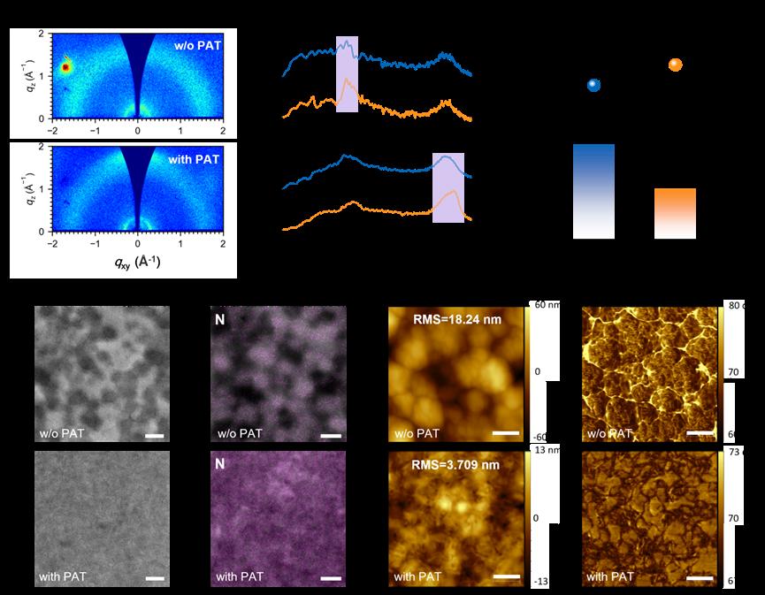 图5. 未加PAT与加PAT的SS-PM6:Y6:PC71BM薄膜形貌表征。(a) 2D GIWAXS图样;(b) 相应的1D径向积分曲线(面内与面外方向);(c) π-π堆叠间距和晶体相干长度(CCL);(d)薄膜的SEM图像;(e) 氮元素分布图;(f) AFM高度图;(g) AFM相位图。(比例尺200 nm