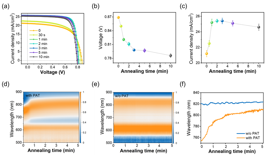 图6. 热退火对器件性能与光谱演化的影响。(a)在110 ℃下经不同退火时间处理后的器件J–V曲线;(b) VOC随退火时间的变化;(c) JSC随退火时间的变化;(d–e) 在110 ℃退火5 min过程中,含/不含PAT的SS-PM6:Y6:PC71BM薄膜的原位吸收光谱演化;(f) Y6吸收峰在退火过程中的演化趋势。