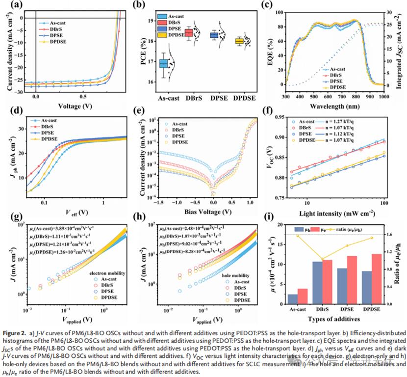 暗电流与光强依赖性:通过暗电流-电压曲线和VOC与光强的关系曲线,研究了添加剂对充电复合行为的影响。结果显示,添加添加剂后,双分子复合减少,单分子或陷阱辅助复合的概率降低。