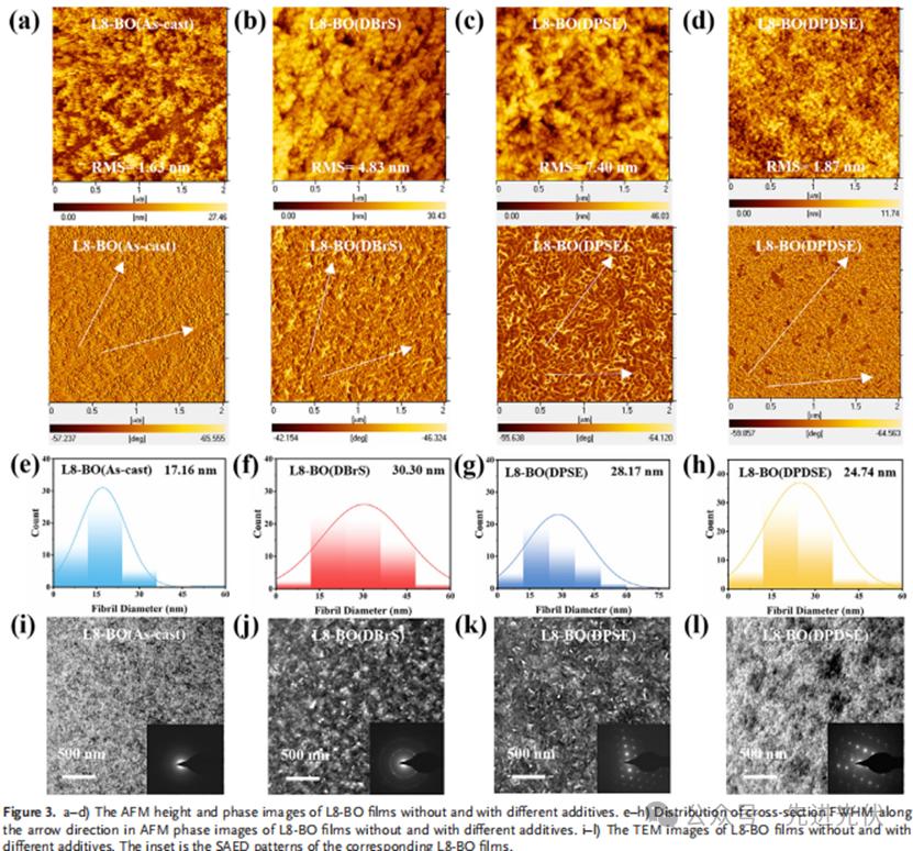 原子力显微镜与透射电子显微镜:通过原子力显微镜(AFM)和透射电子显微镜(TEM)分析发现,添加DBrS、DPSE和DPDSE的L8-BO薄膜显示出明显的纤维状形貌。AFM分析显示,表面粗糙度(RMS)增加,同时纤维宽度也增加。