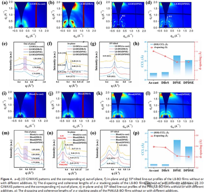 掠入射广角X射线散射GIWAXS:图4展示了纯L8-BO薄膜和添加不同添加剂(DBrS、DPSE和DPDSE)后的薄膜的掠入射广角X射线散射(GIWAXS)结果及其分析。从2D GIWAXS图案和对应的线切割轮廓中可以看出,未经处理的L8-BO薄膜表现出面朝向取向,在平面外方向上具有π-π堆积峰。添加三种不同的添加剂后,L8-BO薄膜显示出多个衍射峰,包括远离主平面的(011)峰,表明L8-BO纤维是多晶的。经过DPSE和DPDSE处理的薄膜的多晶衍射峰也与其SAED衍射图案相对应。π-π堆积峰的结晶相干长度(CCL)在平面内和55°倾斜方向上显著增加,证实了更有序的分子堆积。此外,π-π堆积距离从未经处理的3.61 Å减少到DBrS处理的3.49 Å、DPSE和DPDSE处理的3.38 Å。同时,(11-1)和(021)衍射峰的d间距显著减小,表明添加剂与L8-BO之间的分子间相互作用压缩了初始松散的分子堆积,形成高度有序、紧密堆积且高结晶度的纤维。GIWAXS结果还显示,长程有序的π-π堆积信号和(110)衍射信号的再现进一步证实了L8-BO纤维的长程有序性和高结晶度。这些改进促进了激子扩散和电荷传输,从而提高了有机太阳能电池的性能。