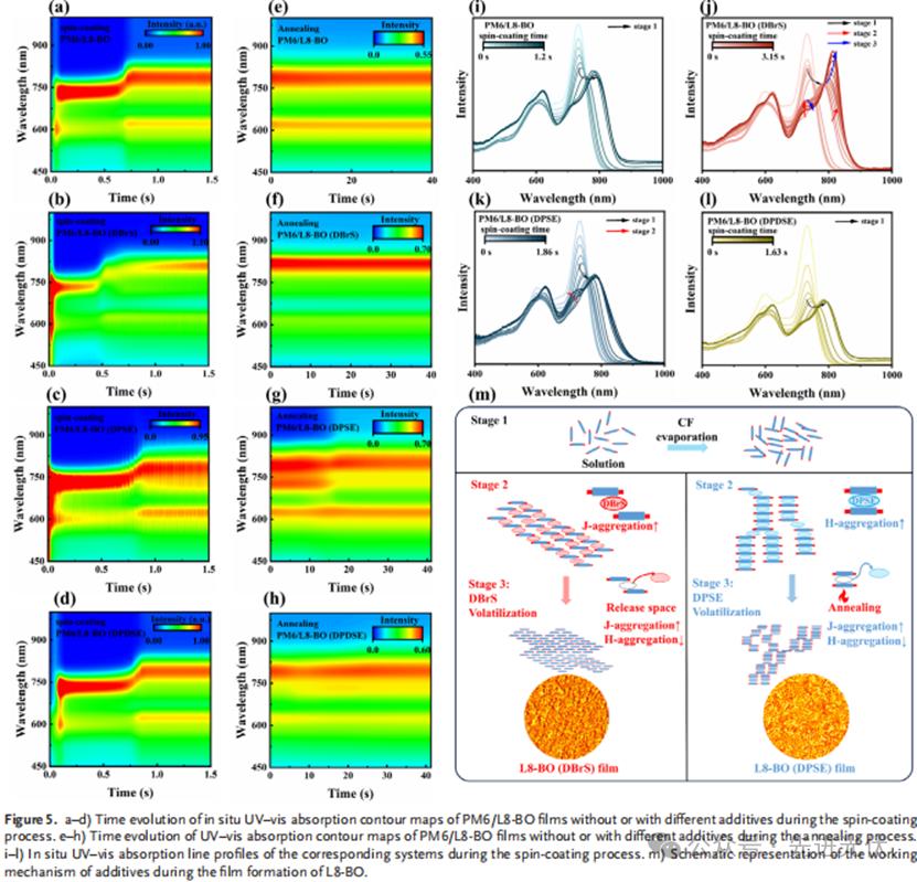 原位紫外-可见吸收光谱:通过原位紫外-可见吸收光谱研究了添加剂对薄膜形成动力学的影响。结果显示,添加DBrS、DPSE和DPDSE延长了结晶时间,增强了添加剂与L8-BO分子的相互作用时间,从而提高了结晶度。