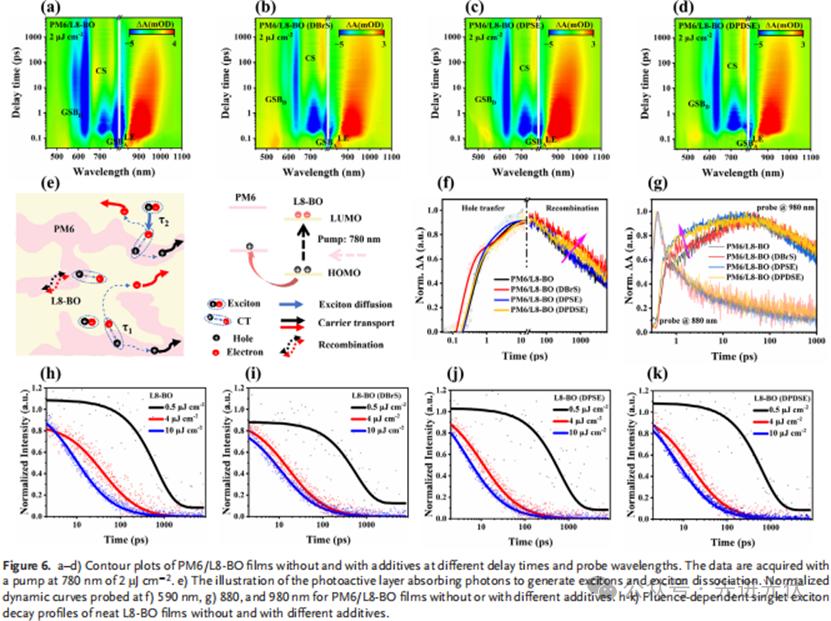 瞬态吸收光谱:通过瞬态吸收光谱(TAS)实验验证了器件性能与光物理性质的相关性。结果显示,添加DBrS、DPSE和DPDSE后,τ1值分别缩短至0.147 ps、0.243 ps和0.287 ps,表明激子解离增强。