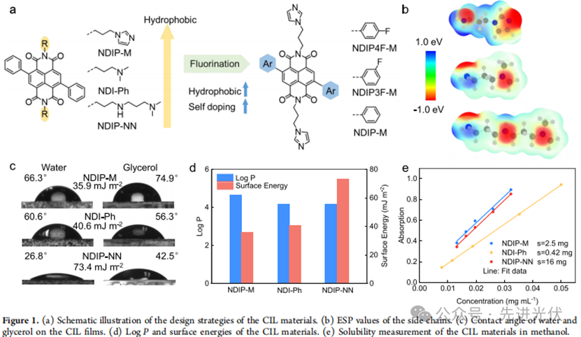 通过侧链工程与氟化策略设计并合成了三种CIL材料(NDIP-M、NDIP3F-M、NDIP4F-M)。氟化显著增强了材料的疏水性,NDIP3F-M表现出最优的能级对齐与降低的陷阱激活能,使其在OPV器件中实现20.1%的光电转换效率(PCE)。接触角测试显示其水接触角达66.3°,表面能低至35.9 mJ/m²,log P值较高,说明其更倾向于疏水环境。在甲醇中具有良好的溶解性,有利于溶液加工。未封装器件在85%相对湿度下400小时后仍保持50%的初始效率,显示出优异的耐湿性。