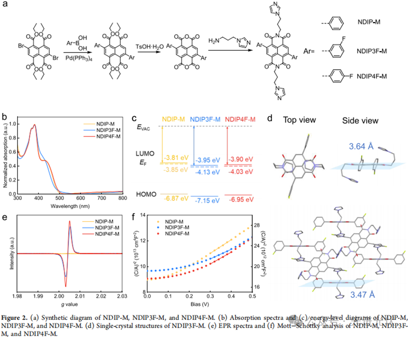 展示了NDIP-M、NDIP3F-M和NDIP4F-M的合成路线,各步骤产率较高。紫外-可见吸收光谱显示氟化引起吸收边蓝移或红移,与理论计算一致。能级测试表明氟化材料的LUMO能级更低,有利于电子提取和自掺杂效应。单晶结构分析显示NDIP3F-M中咪唑单元与NDI骨架堆叠距离为3.64 Å,氟原子与咪唑单元的HOMO轨道相互作用增强。EPR和Mott-Schottky测试进一步证实氟化材料具有更高的自掺杂浓度和电导率。