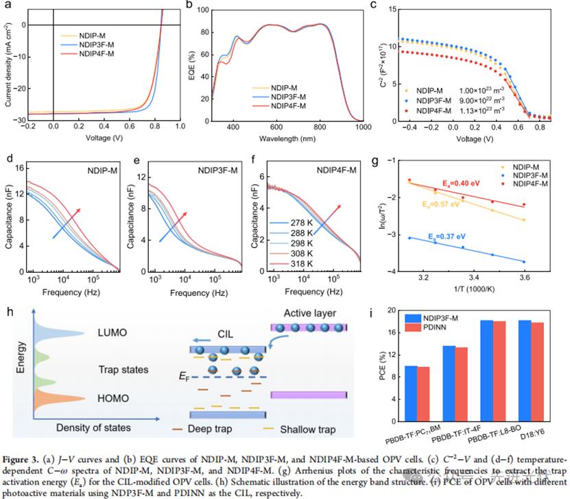 基于NDIP3F-M的OPV器件获得最高PCE(19.2%),主要归因于其高填充因子(FF)。EQE积分电流与J-V测试结果一致。陷阱密度分析显示NDIP3F-M陷阱密度最低(9.00×10²² m⁻³)。温度依赖的电容-频率测试表明其陷阱激活能最低(0.37 eV),有效抑制了陷阱辅助复合。在不同活性层体系中,NDIP3F-M均表现出优于PDINN的性能,显示出良好的普适性。
