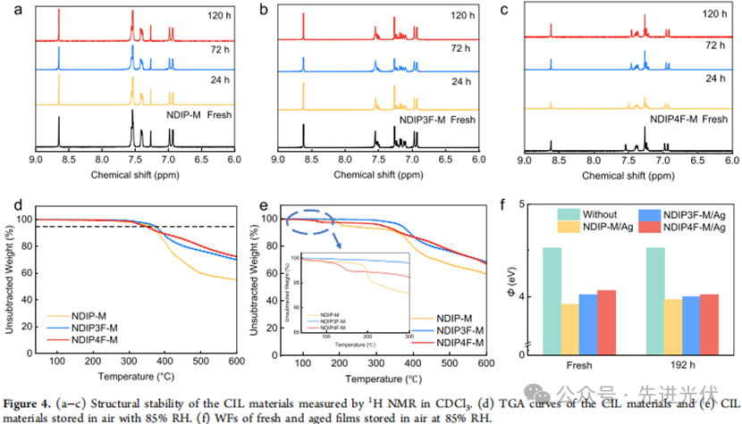 ¹H NMR显示三种材料在CDCl₃中储存120小时后结构稳定。TGA测试表明材料热稳定性良好,分解温度均高于340°C。在高湿环境中,材料略有吸湿,但FT-IR和WF测试表明其化学结构和电极功函数保持稳定,说明CIL层能有效保护电极界面,延缓器件性能衰减。