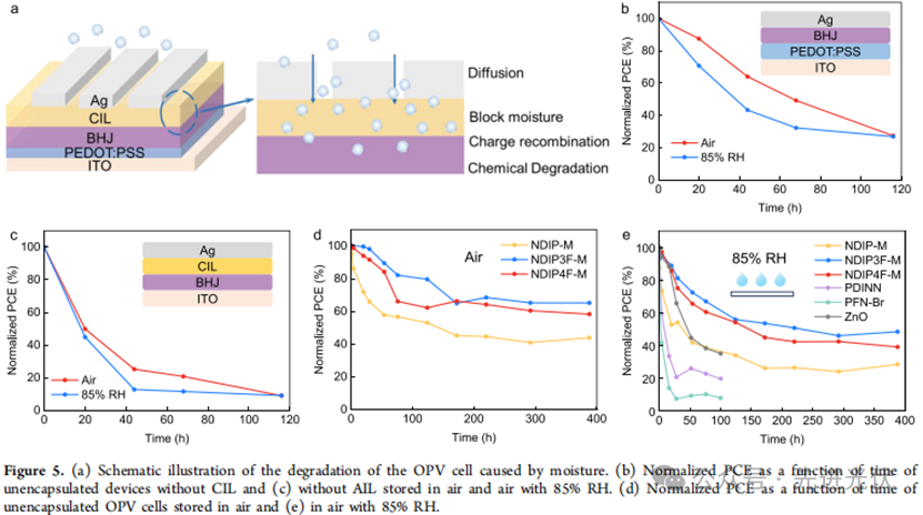 示意图揭示水分侵入导致电荷复合与化学降解的机制。无CIL或无AIL的器件在空气中迅速失效,凸显界面层对器件稳定性的关键作用。NDIP3F-M基器件在85%