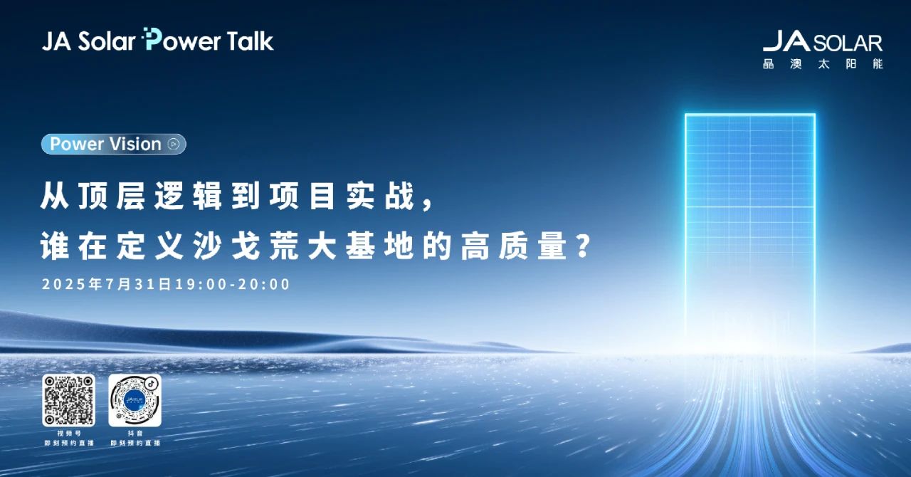 2025年7月31日,专家对话栏目“JA Solar Power Talk”第二期如约而至,本期节目正聚焦于沙戈荒光伏建设。内蒙古电力勘测设计院主设韩晓亮、宁夏回族自治区电力设计院主设刘子瑞、晶澳科技产品与解决方案研发中心产品部负责人,作为本期嘉宾展开深度对话,光伏們创始人王超全程主持。