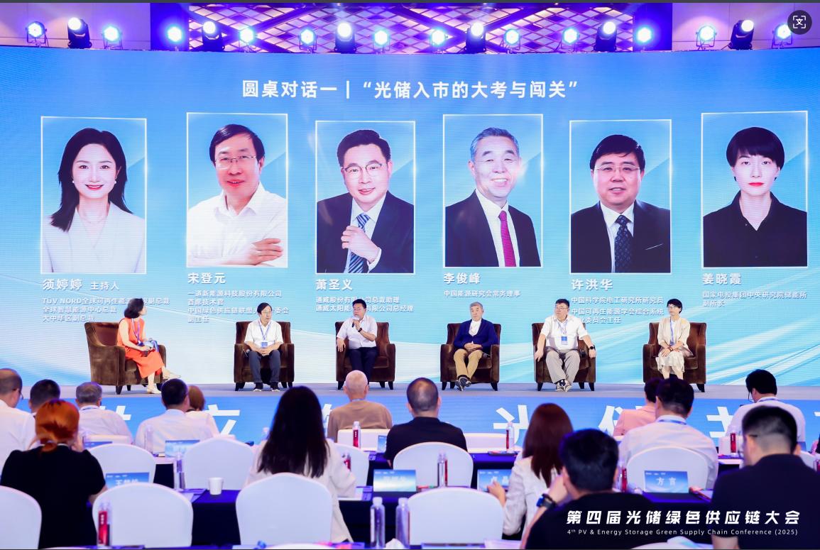 第一场圆桌对话由TÜV NORD全球可再生能源高级副总裁、全球智慧能源中心总裁、大中华区副总裁须婷婷主持。中国能源研究会常务理事李俊峰,中国科学院电工研究所研究员、中国可再生能源学会综合系统专业委员会主任许洪华,国家电投集团中央研究院储能所副所长姜晓霞,通威股份有限公司总裁助理、通威太阳能科技有限公司总经理萧圣义、一道新能源科技股份有限公司首席技术官宋登元等嘉宾,围绕全产业链协同破局路径、光储融合必要性论证、西部基地消纳技术方案、市场断崖风险预警、场景化商业模式转型等核心议题展开深度讨论。