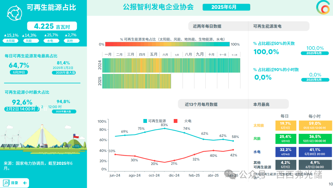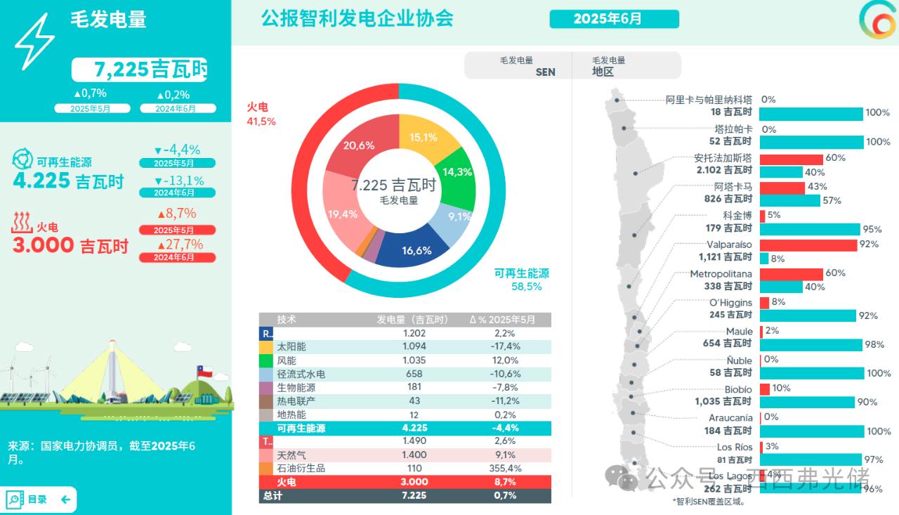 2025年6月,智利国家电力系统(SEN)对可再生能源的依赖表现强劲,其发电量占当月总发电量的58.5%。根据智利发电商协会(Generadoras de Chile)发布的2025年6月公告,在7.225 GWh的总发电量中,可再生能源贡献了4.225 GWh。这一表现凸显了该国正在进行的能源转型,同时也使电网拥堵和能源削减等运营挑战浮出水面。该报告使用了来自智利国家电力协调中心及其他公共来源的数据,为该国的电力行业提供了详细的快照。