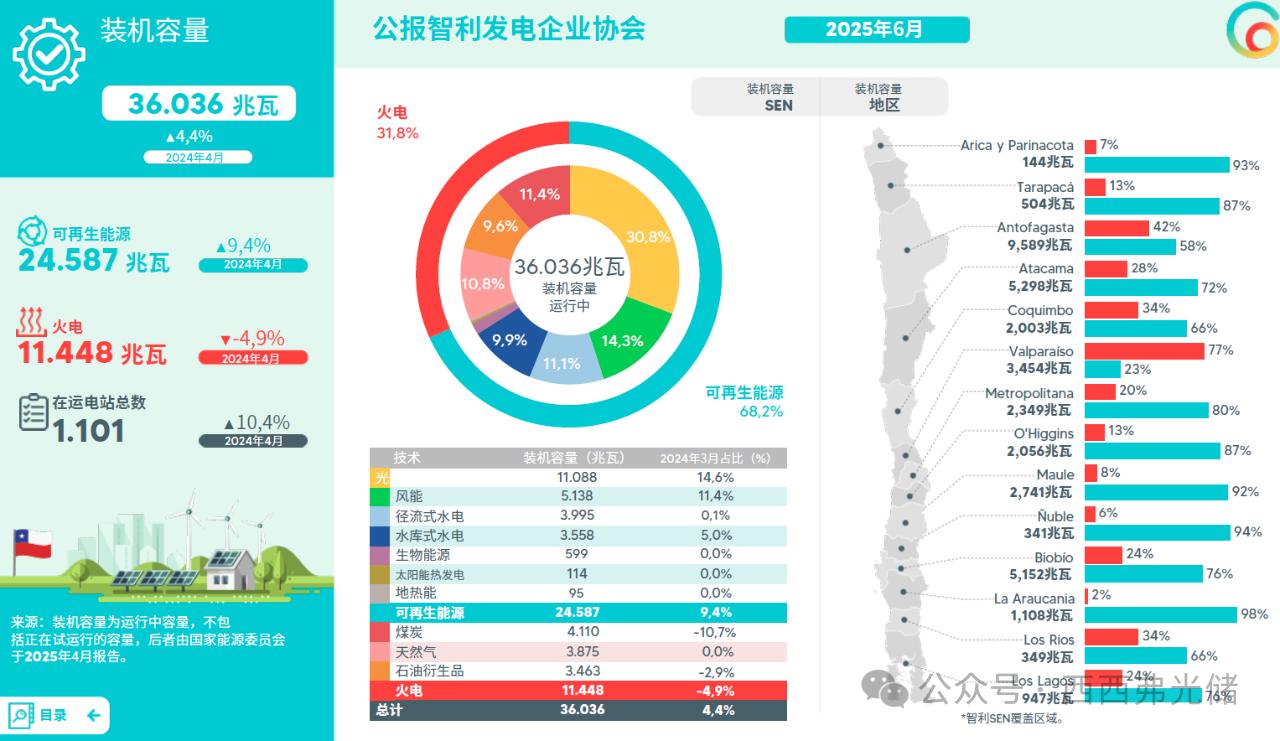 更新至2024年4月的数据显示,智利的总装机容量为36036 MW。其中,可再生能源技术占主导地位,达到68.2%,即24587 MW,而火电装机容量占31.8%(11448 MW)。
