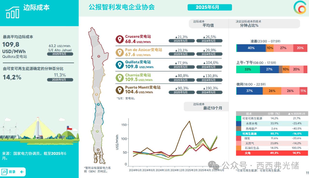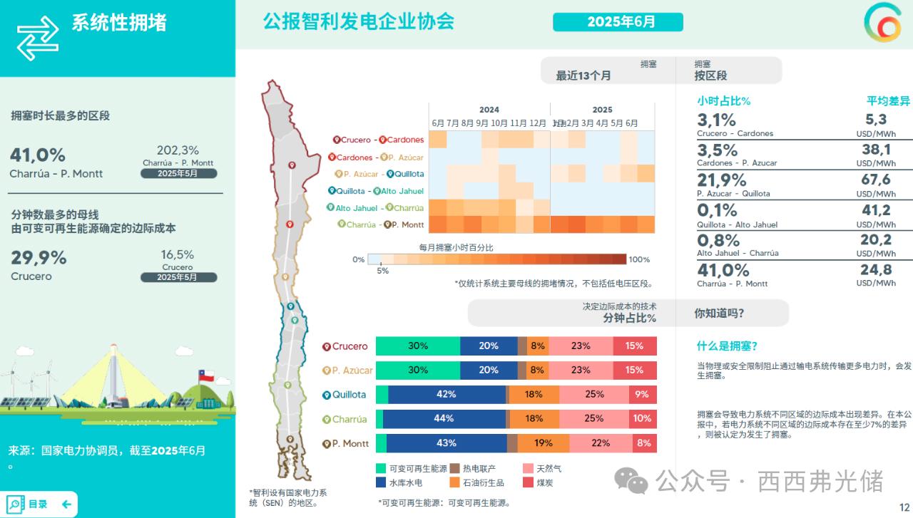 当输电网络因物理或安全限制而无法输送所有可用电力时,就会发生这种情况。6月份,受影响最严重的地区是Charrúa – P. Montt输电断面,该区域在当月41%的时间里都处于拥堵状态。这一瓶颈在两点之间造成了平均每兆瓦时24.8美元的边际成本差异。