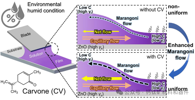 研究人员解释说,在刀片涂布过程中,CV的添加还诱导了强烈的向内马兰戈尼(Marangoni)流,从而实现了大面积的均匀形态。马兰戈尼效应由温度或浓度梯度引起的界面张力局部差异驱动的流动组成。通过这种修饰,研究人员能够在 10% 至 70% 的环境相对湿度下创建均匀的光敏薄膜。在测试中,采用CV工艺的大面积有机光伏电池在尺寸为20.33平方厘米的组件上实现了16.27%的功率转换效率。