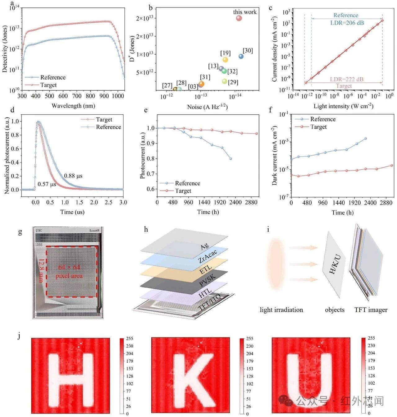 最后,研究人员对该光电探测器的比探测率、线性动态范围、响应速度和稳定性进行了详细测试。研究人员将钙钛矿光电二极管与薄膜晶体管(TFT)集成为图像传感器(如图4g-图4i),并且测试了基于该探测器的图像传感器的成像性能,相关结果如图4j所示。